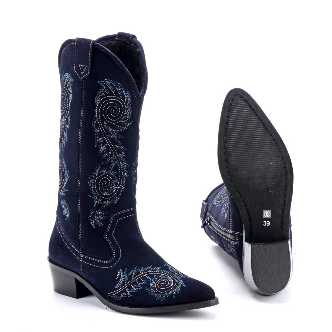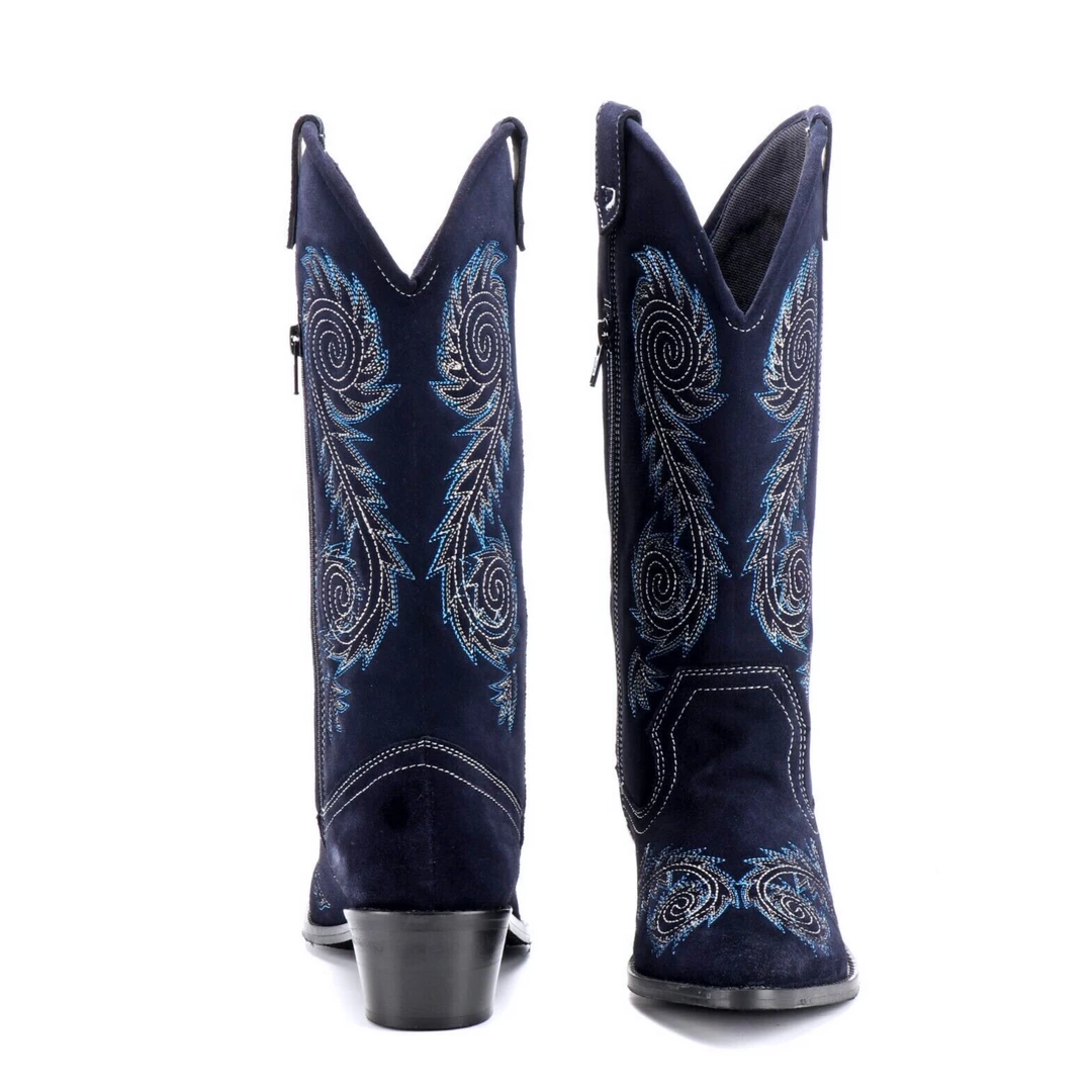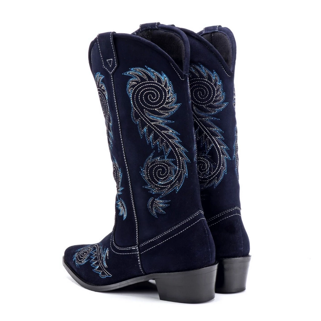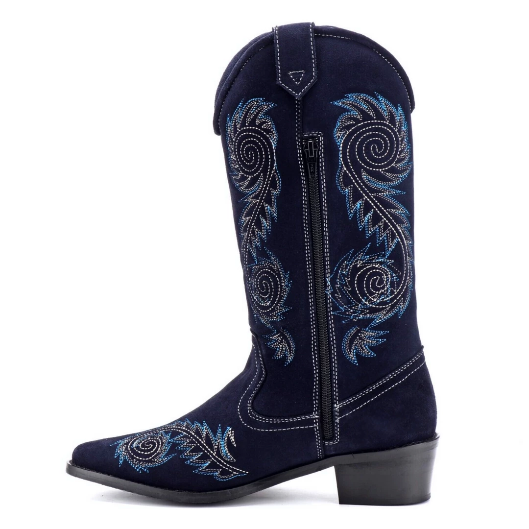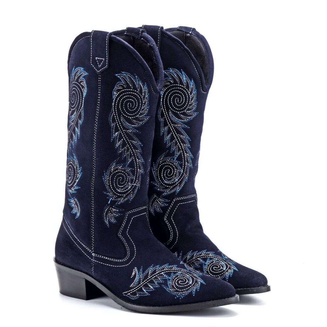 New in for this Season are these amazing Blue Suede Cowboy Boots for Women. Available in sizes 3-9, they feature a flattering curved top with contemporary western contrast stitching in light blue.