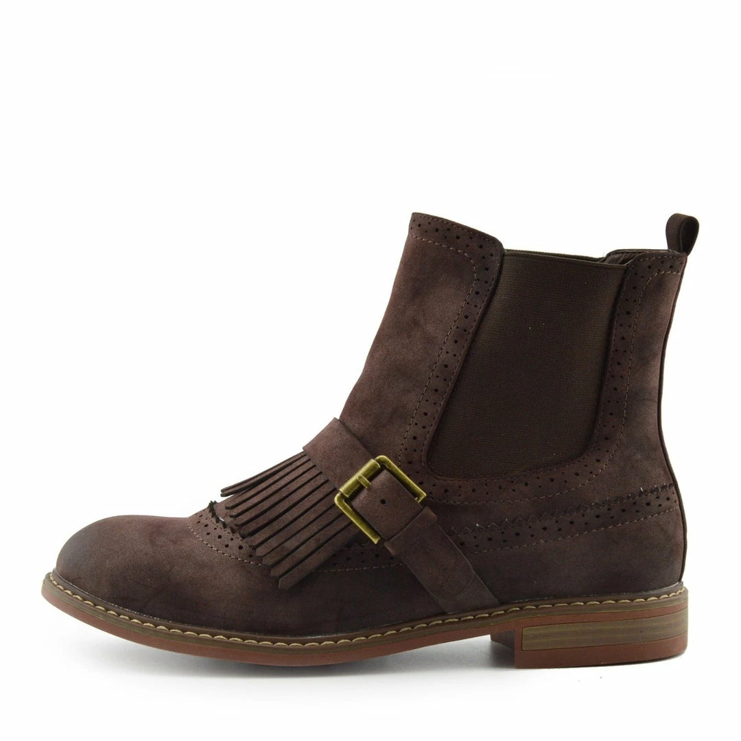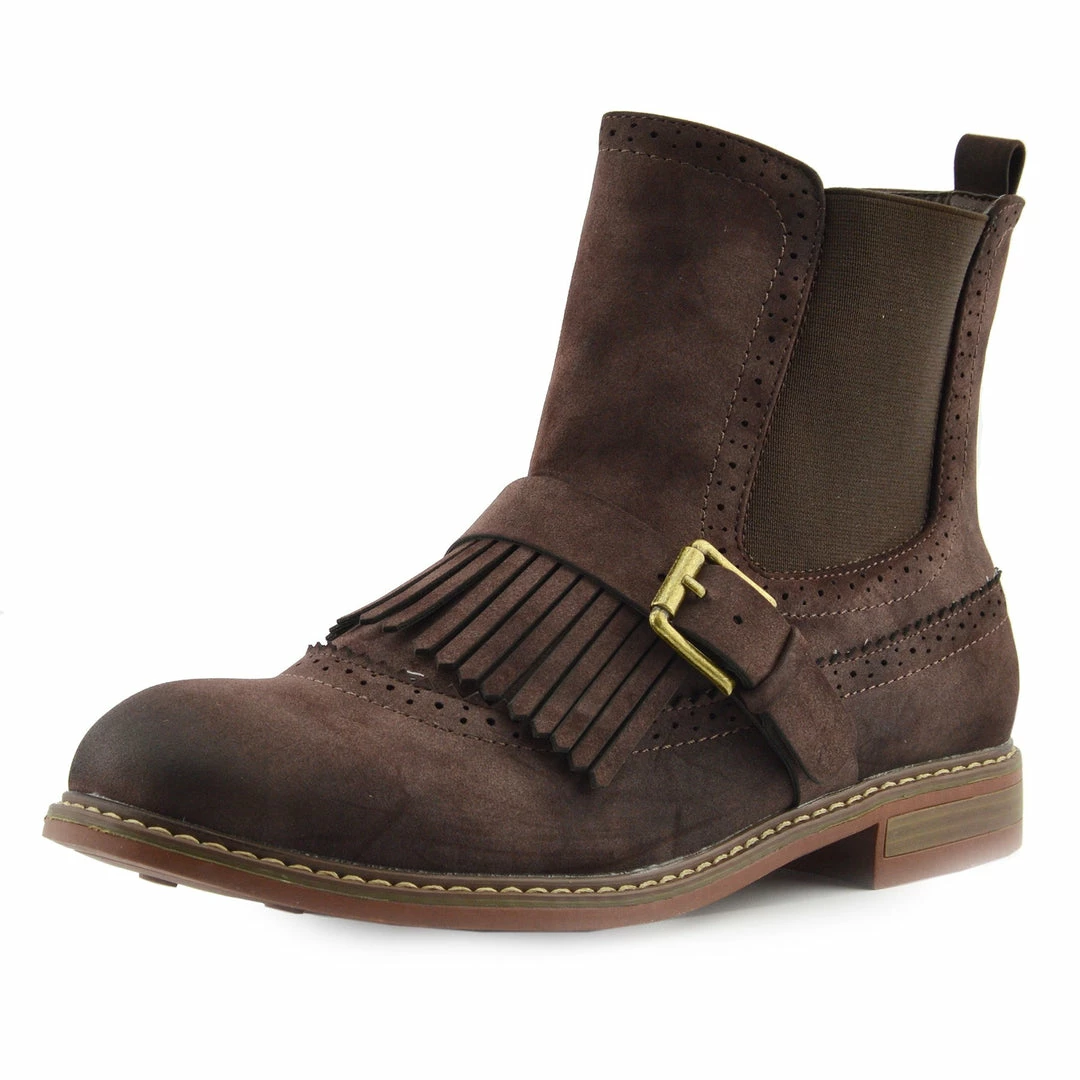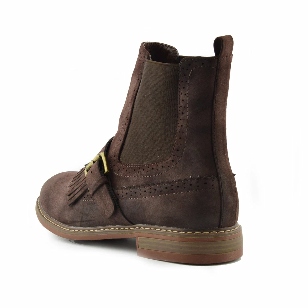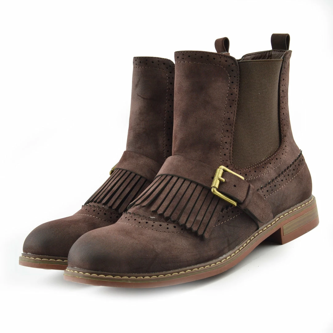 These boots feature tool work across the boot, a fringe on the toe paired with a strap and buckle. The sole has a slight heel, ensuring these shoes are comfortable and casual. Great for winter or paired between seasons with a midi dress, it’s the details on these shoes that you will love.
