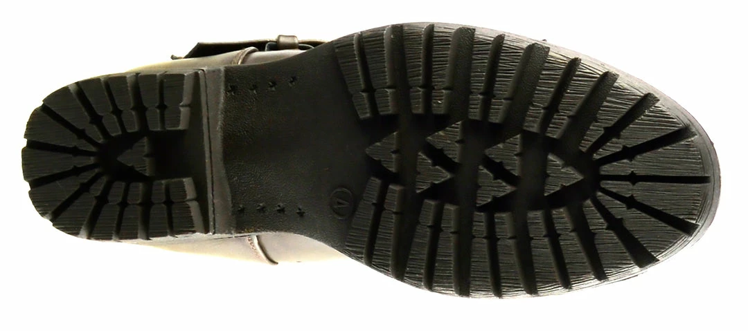 Not only do they have a flat grip sole but they also have a wide calf with a side zip ensuring they are easy to wear. The double strap and metal buckle detail add to the military look for these boots. A great casual pair of boots for winter, style these boots over jeans or pair with a knit dress and stockings.