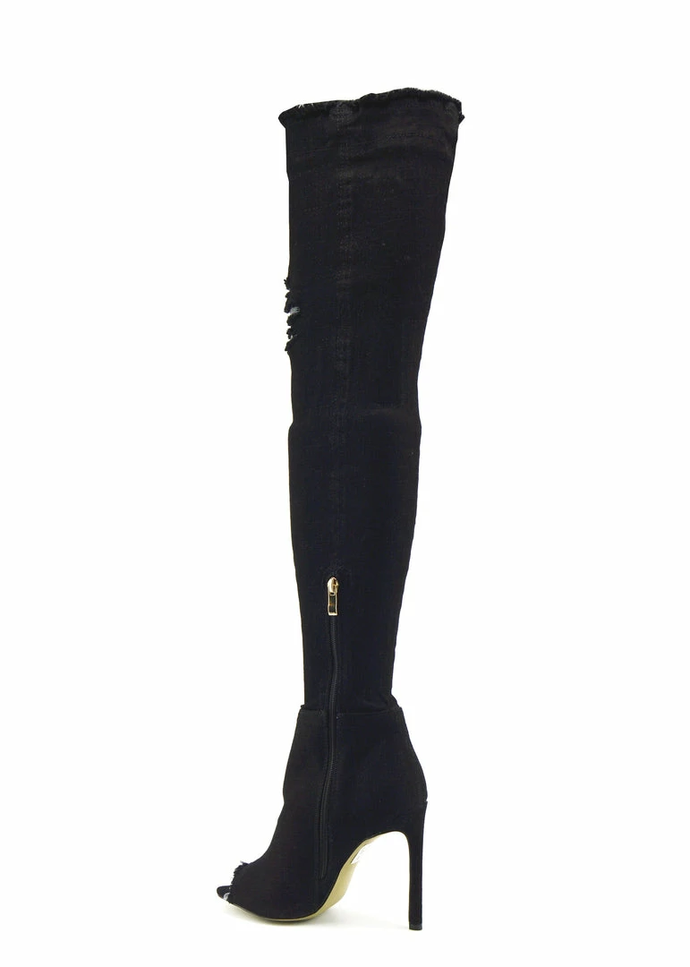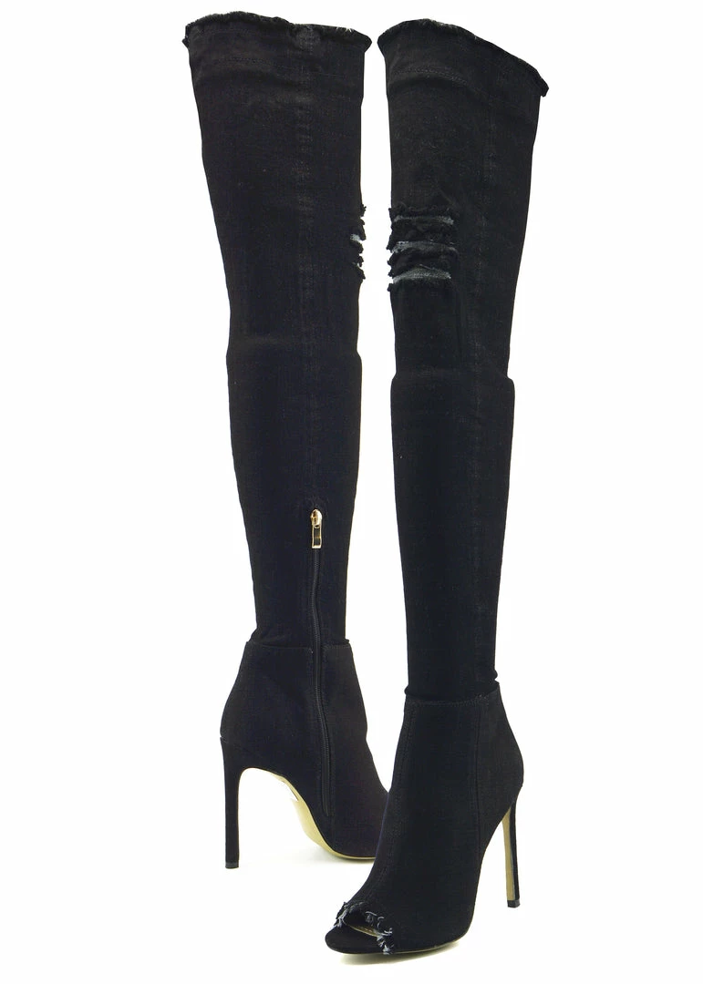 These thigh-high, stretch denim boots flatter and lengthen your legs at the same time. The stretch denim fits easily over the knee while the open toe and stiletto heel add a sense of lightness.