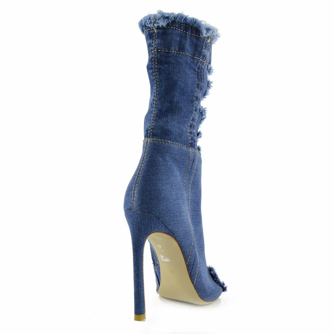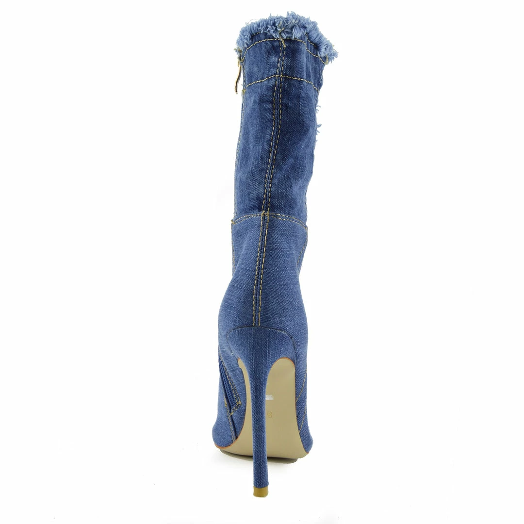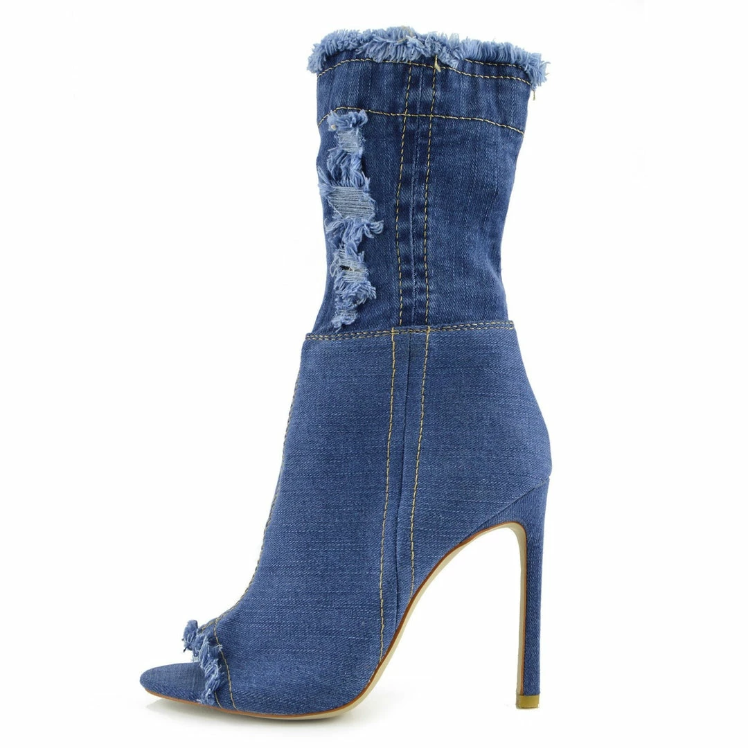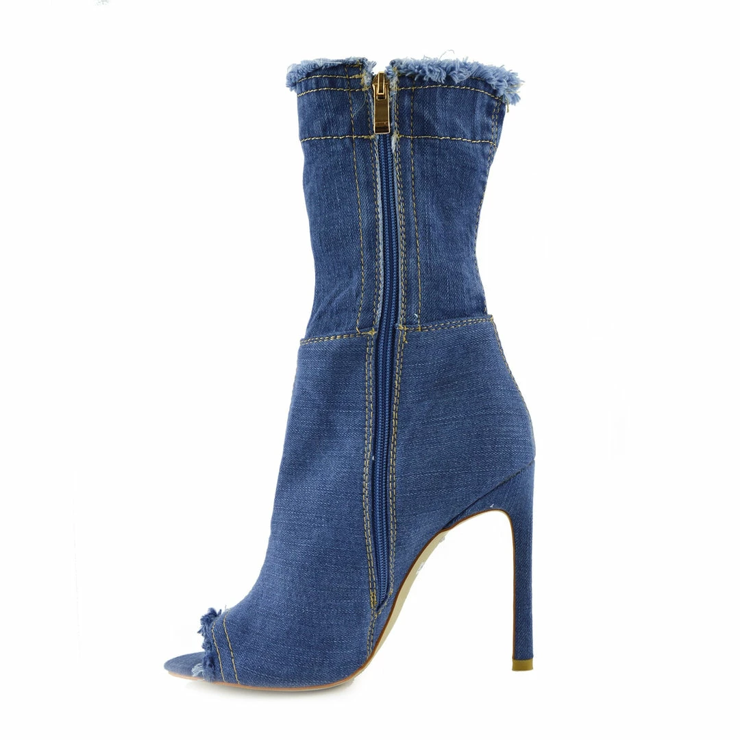 These thigh-high, stretch denim boots flatter and lengthen your legs at the same time. The stretch denim fits easily over the knee while the open toe and stiletto heel add a sense of lightness.