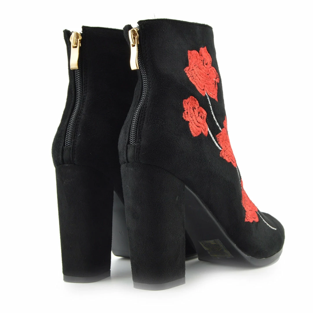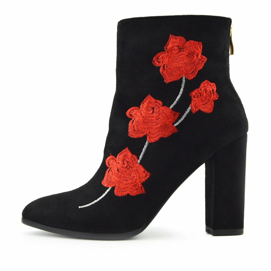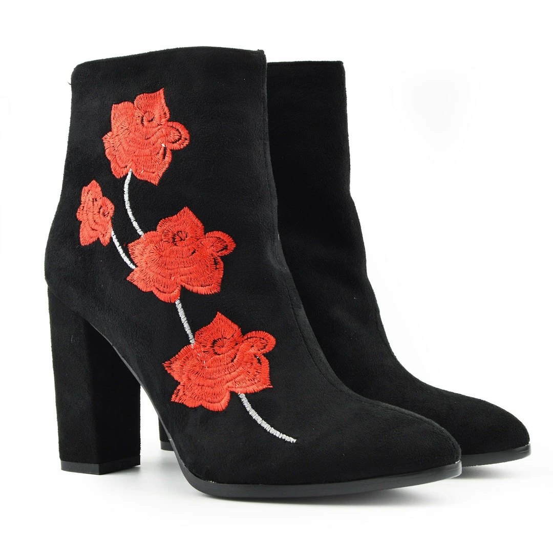 Ladies Fashion Velvet Floral Embroidered Fashion Block Heel Ankle Boots