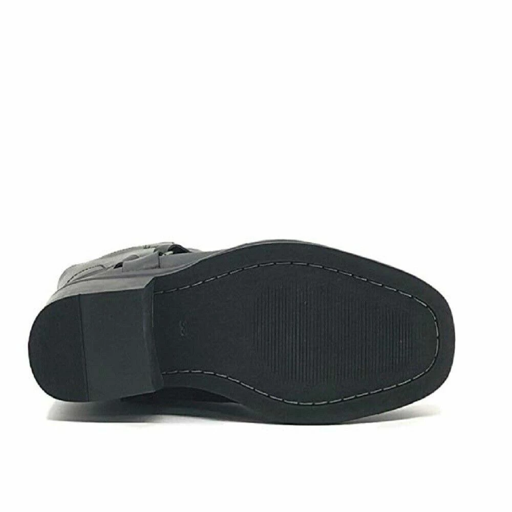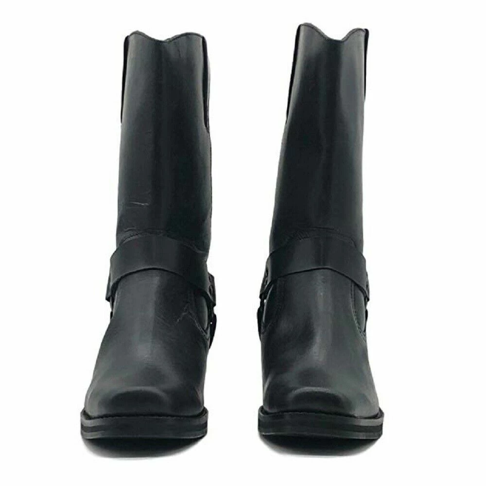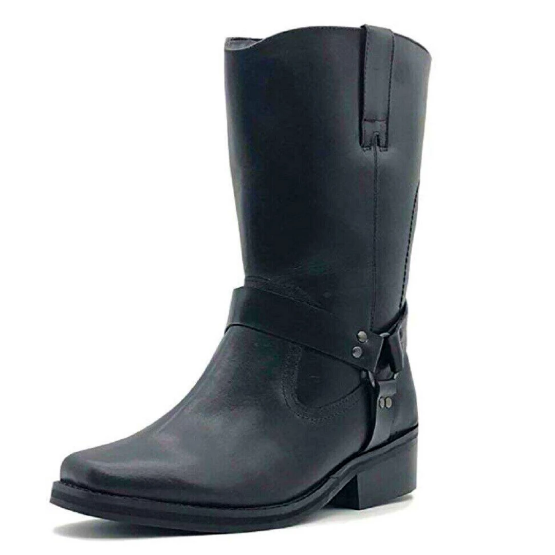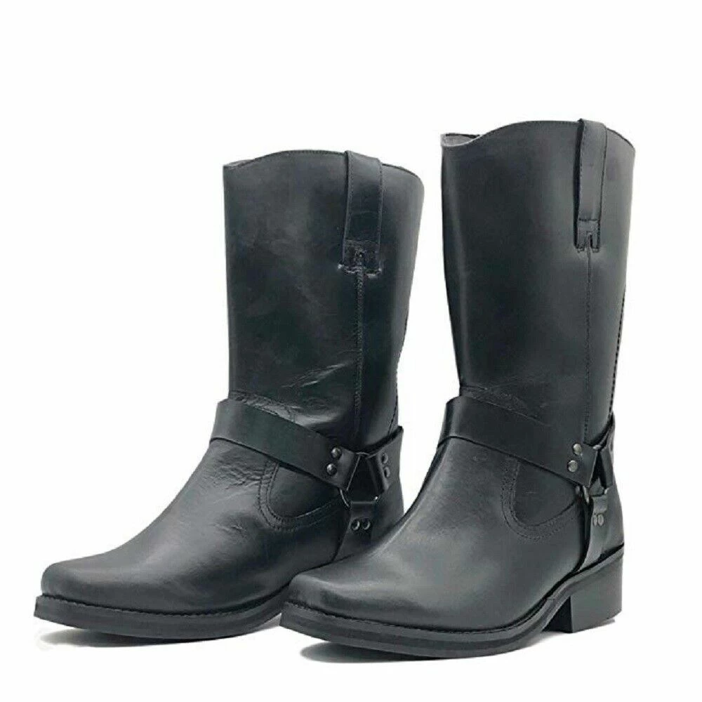 These long sturdy and comfortable boots are a slip on style with no zip, they have a tapered toe which is squared off for a biker style, a great impact sole and trendy biker harness ankle feature. The leather is beaten, so will have some differences to the item shown but amazing quality and the value for money is unbeatable.