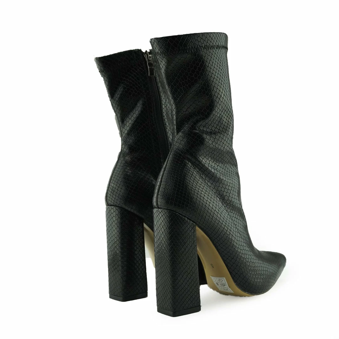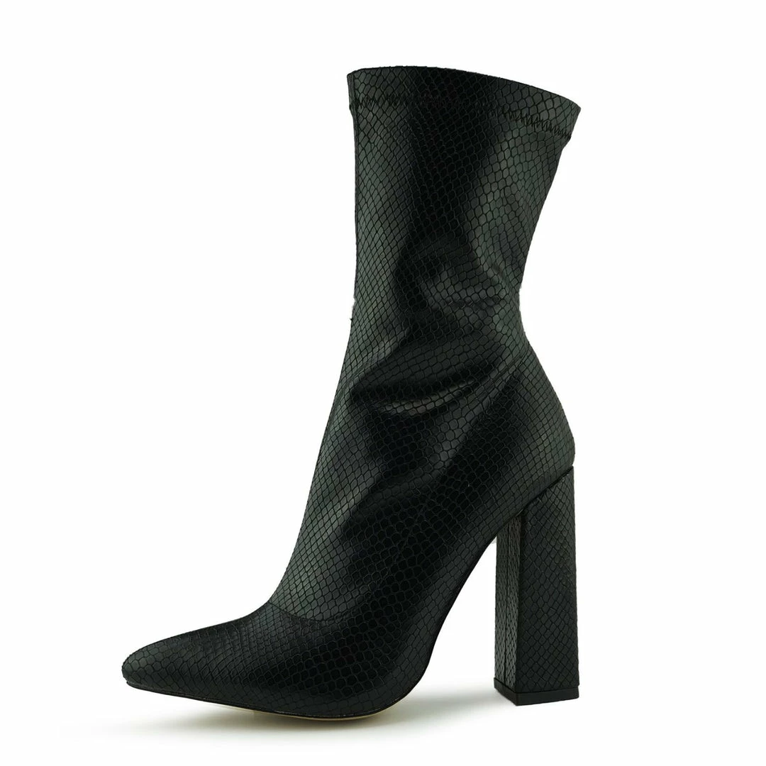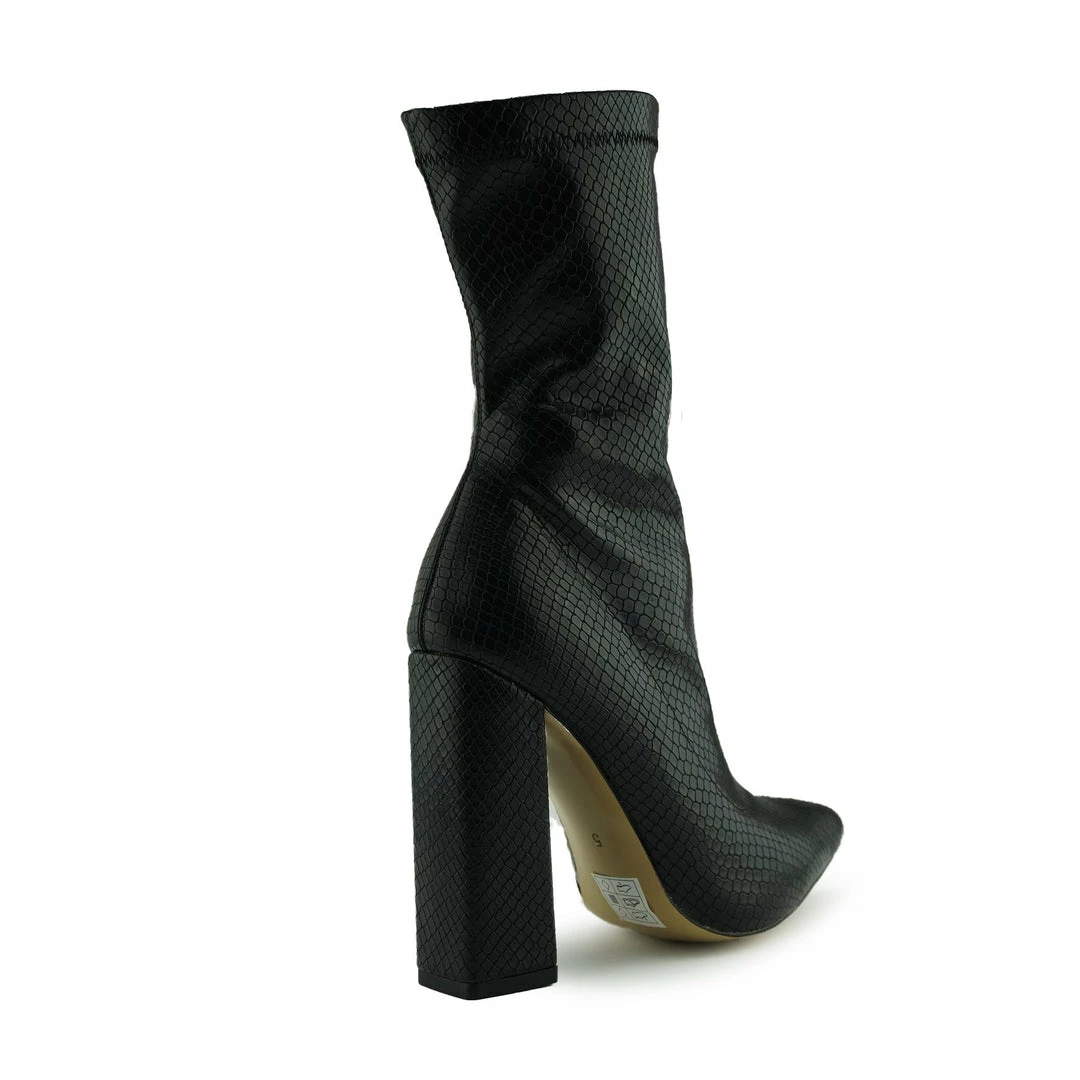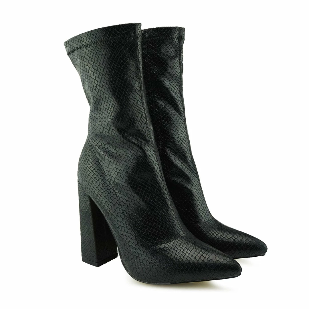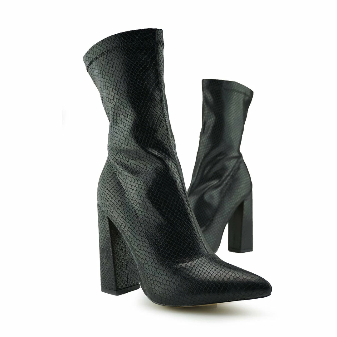 These Selena Boots are just stunning! With the hottest heel shape of this season; the retro inspired architectural block heel, combined with a slim fitting sock style make these boots a must have for any fashionista! With a wet look snake effect, these high ankle sock boots can be dressed down with a mom style jean with frayed hemline for a daytime look or ramp up an edgy outfit just in time for the party season. However, you wear them, these versatile boots are certain to turn heads for all the right reasons.