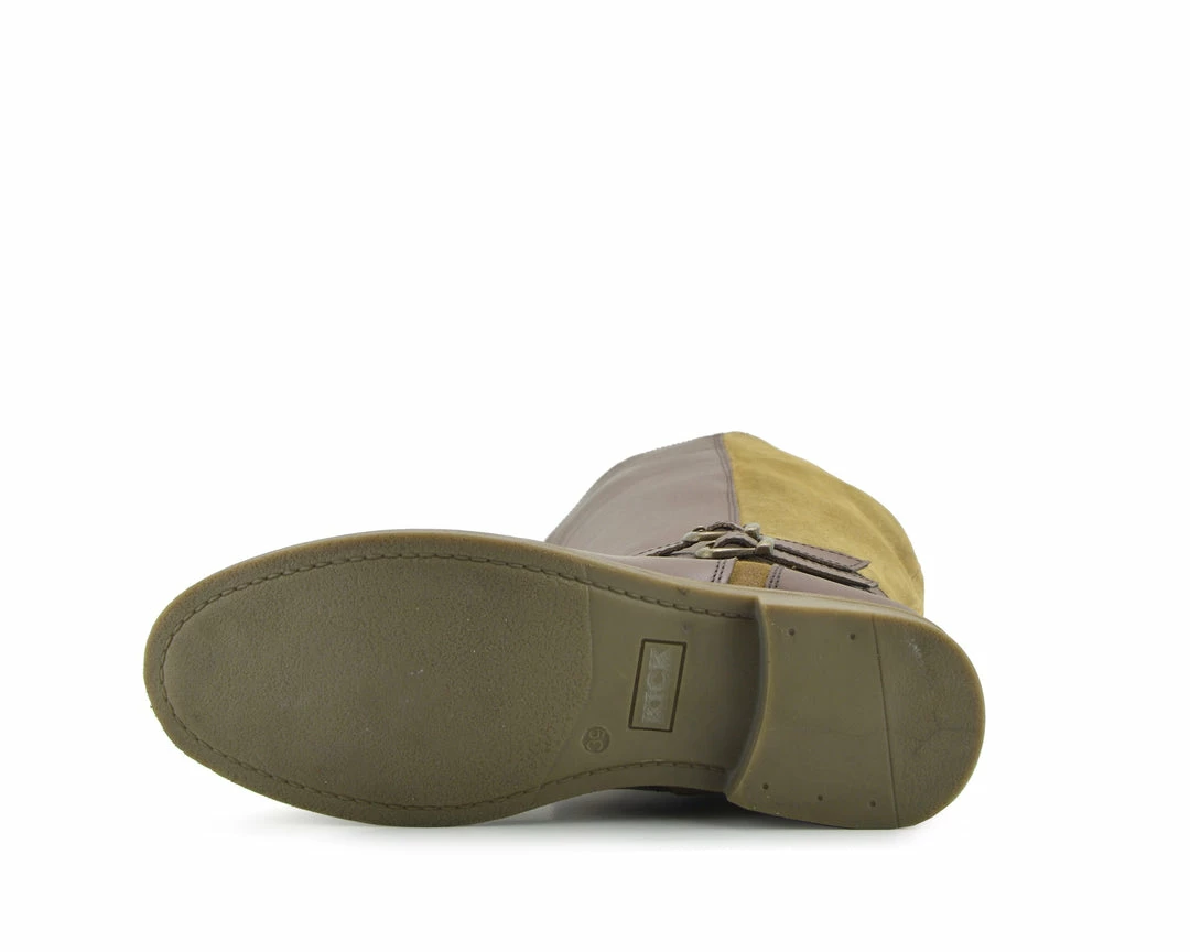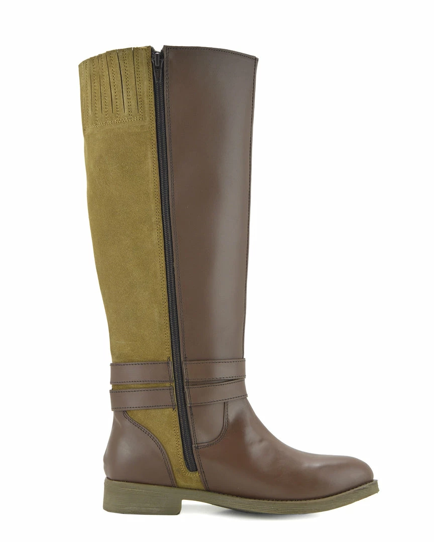Sitting knee-high, these wide calf riding boots mirror polo fashion. A mix of leather and softer materials, they feature two side straps with gold buckle detail across the ankle. With a flat sole, look chic and preppy yet comfortable in these tall riding boots.