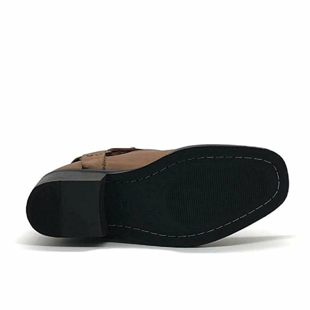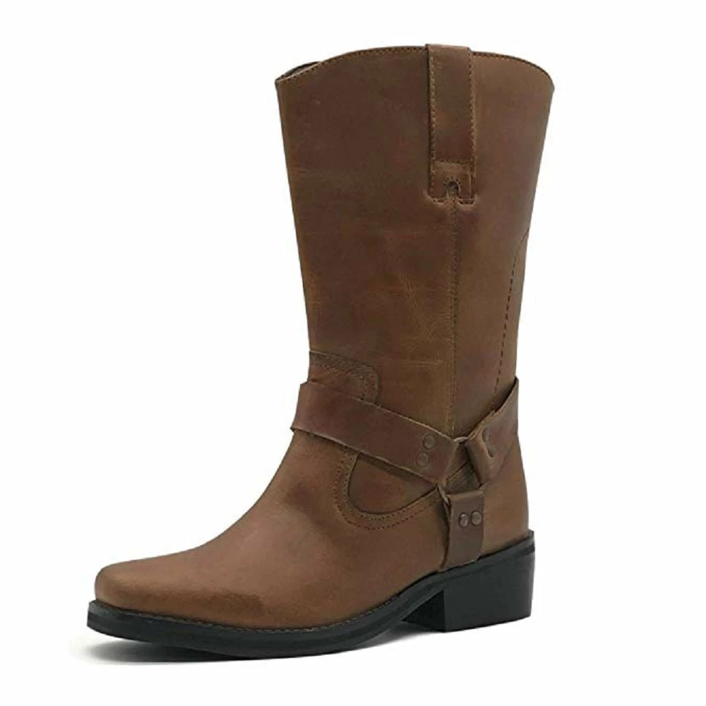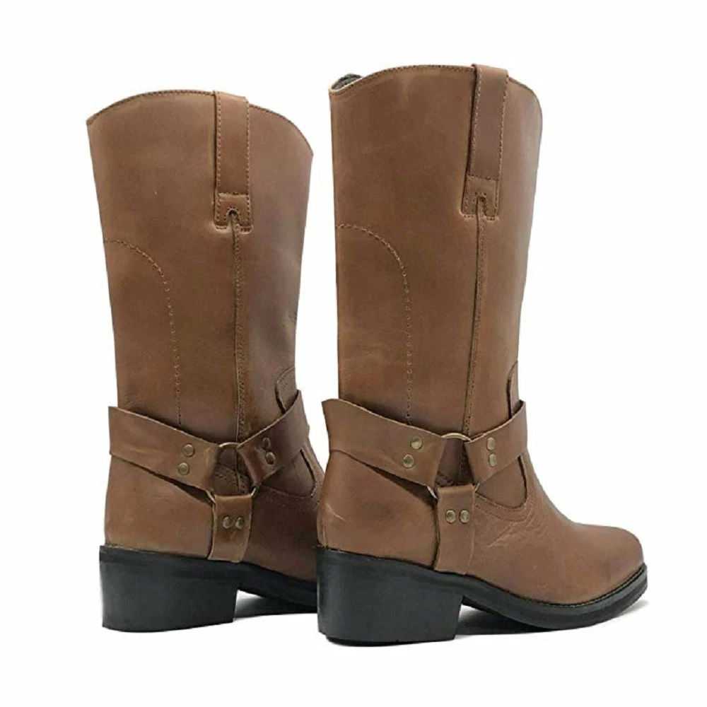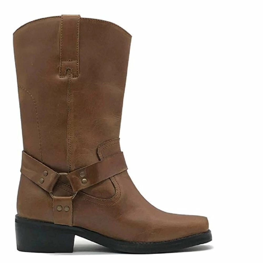 These long sturdy and comfortable boots are a slip on style with no zip, they have a tapered toe which is squared off for a biker style, a great impact sole and trendy biker harness ankle feature. The leather is beaten, so will have some differences to the item shown but amazing quality and the value for money is unbeatable.