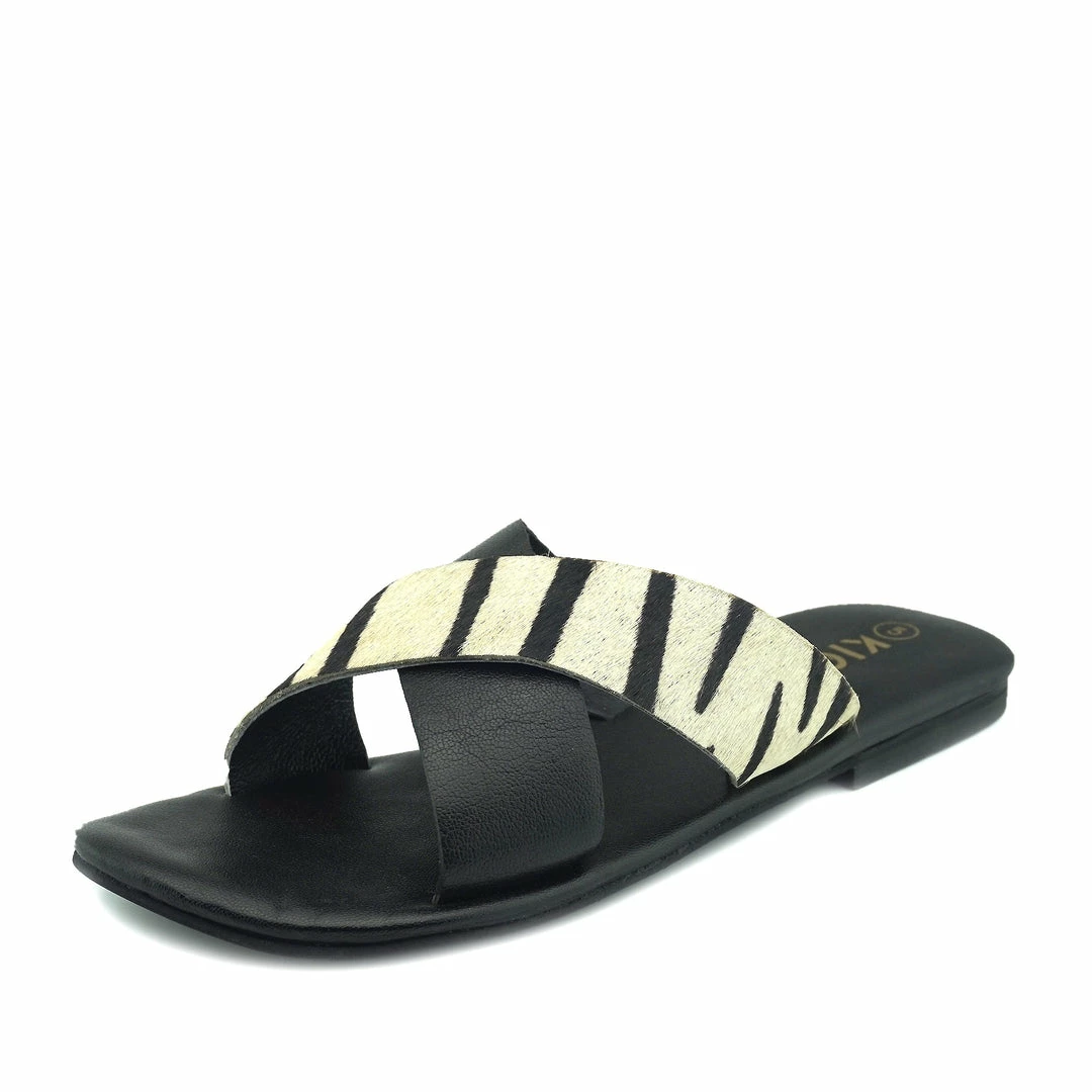 Leather Cross Strap Sliders Comfort Sole Summer Sandals Zebra|Mono|Metallic